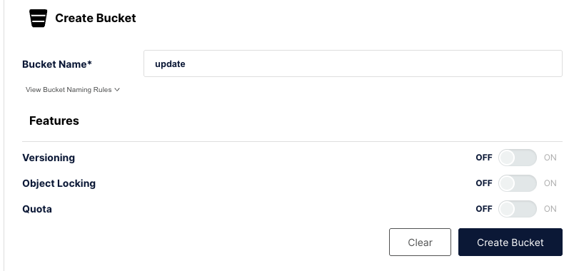 2. Add a read-only bucket called update, by going to http://localhost:9001 and login using minioadmin/minioadmin, click Create bucket fill in the details.